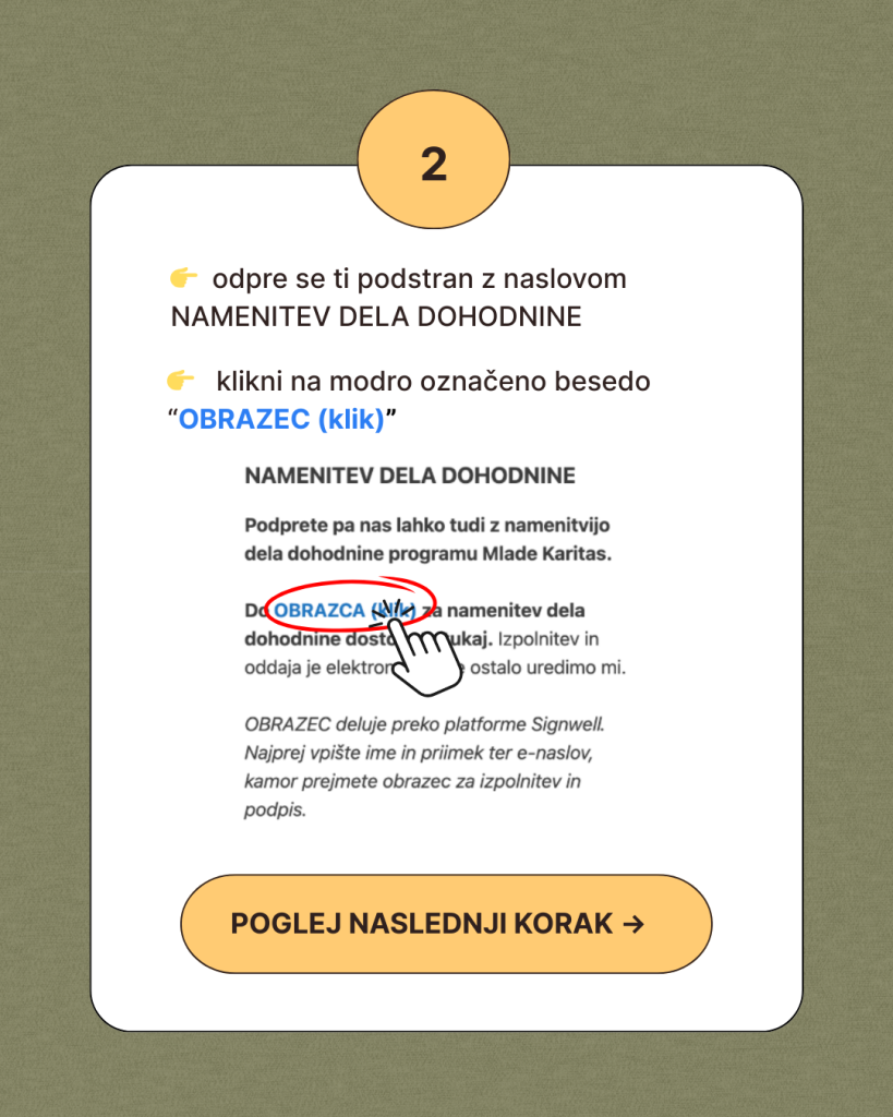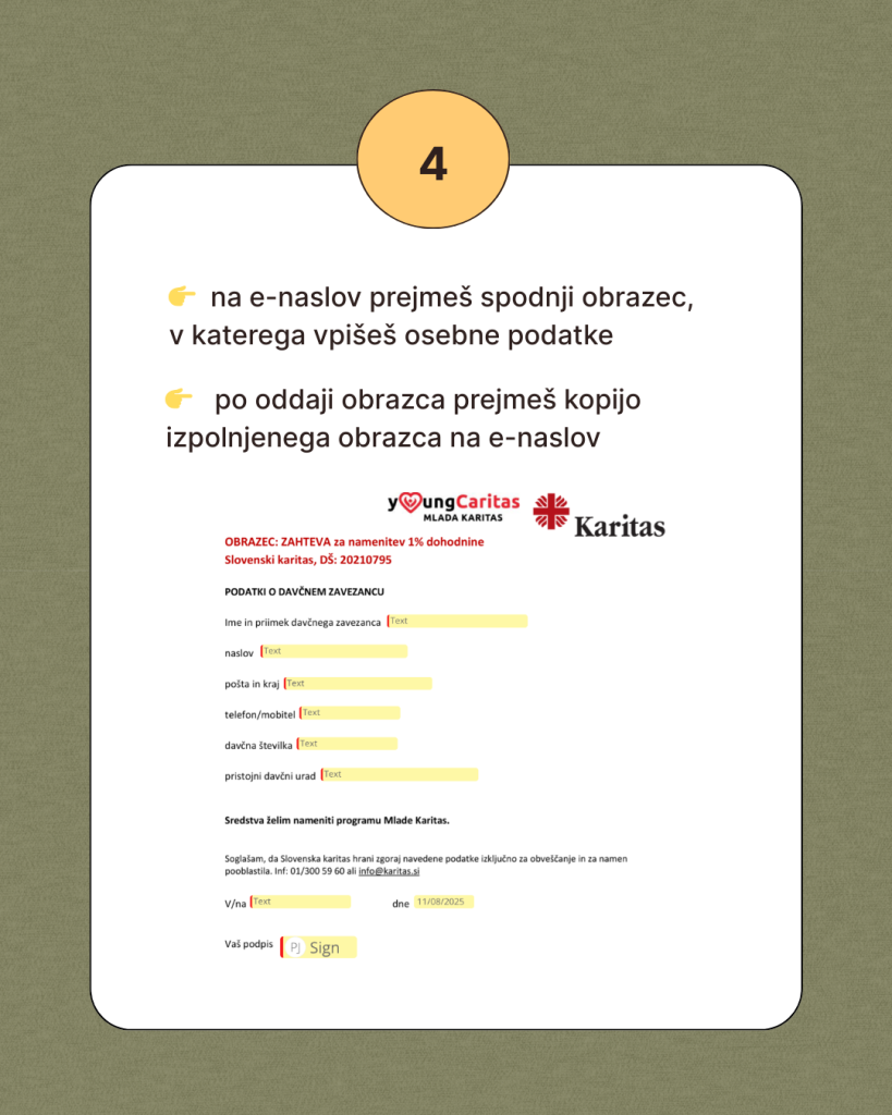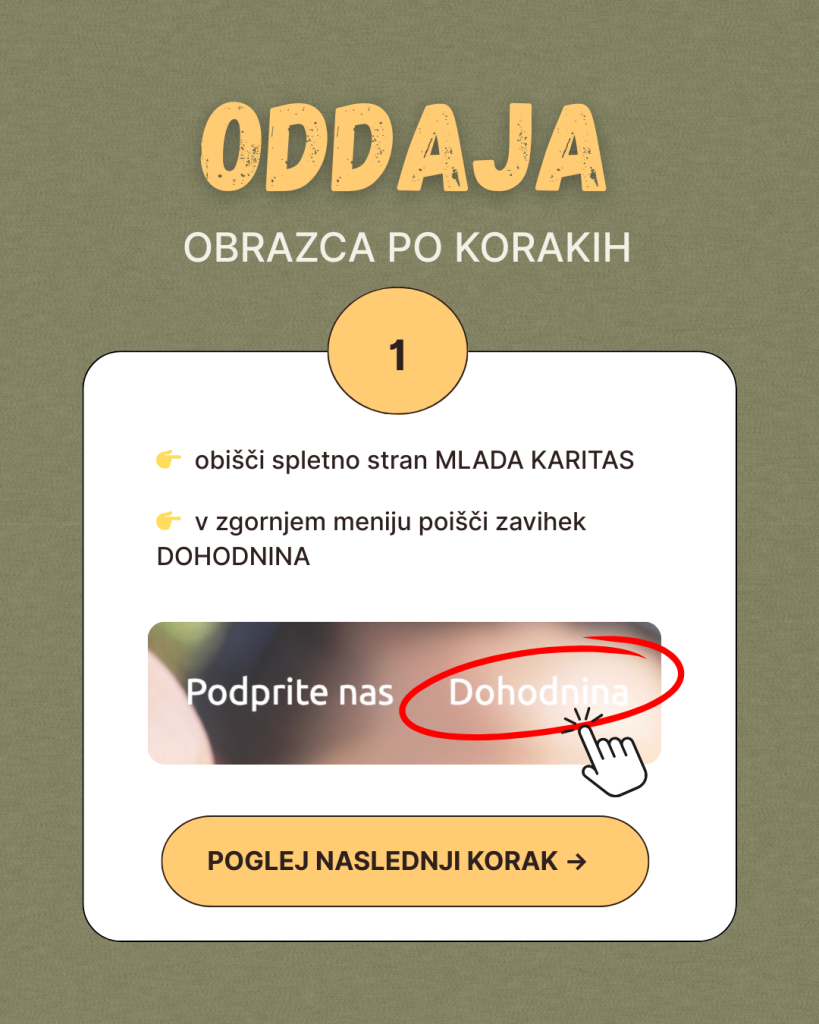 je letošnje geslo kampanje. 1 % dohodnine predstavlja sredstva, ki jih bomo morali plačati v vsakem primeru, le preusmerimo jih lahko namesto države. V Sloveniji namreč lahko en odstotek svoje dohodnine, za vsakega posameznika odmerjene skladno o zakonom, namenimo za financiranje različnih nevladnih organizacij in zavodov. Mednje spada tudi Mlada Karitas, pri čemer donatorji zaradi svojega prispevka ne bomo v ničemer prikrajšani – za nas je donacija brezplačna, dodatnih stroškov s preusmeritvijo sredstev ni.