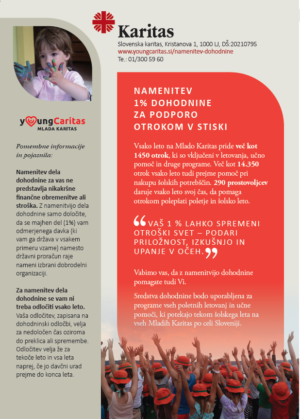 Podprete pa nas lahko z namenitvijo dela dohodnine programu Mlade Karitas.